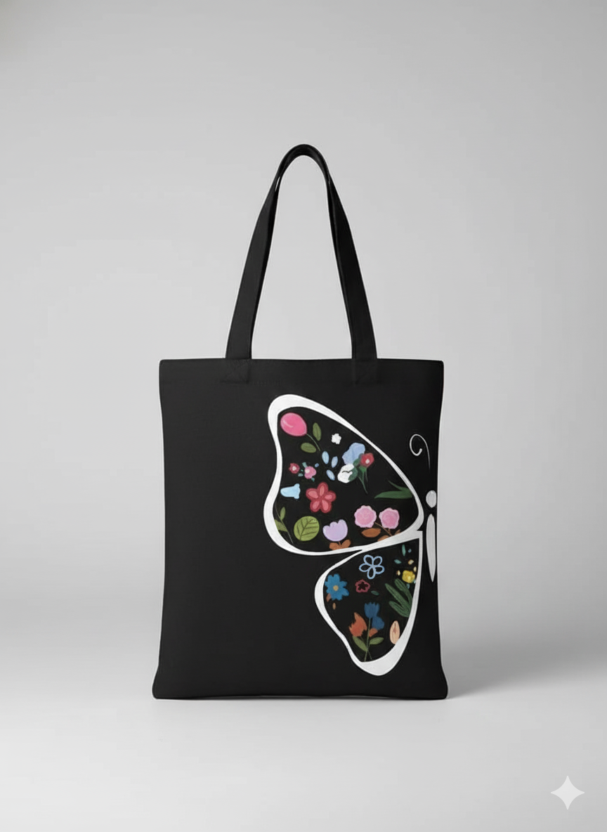 Trendy black tote bag with a colorful butterfly design — stylish, lightweight, and perfect for everyday use.