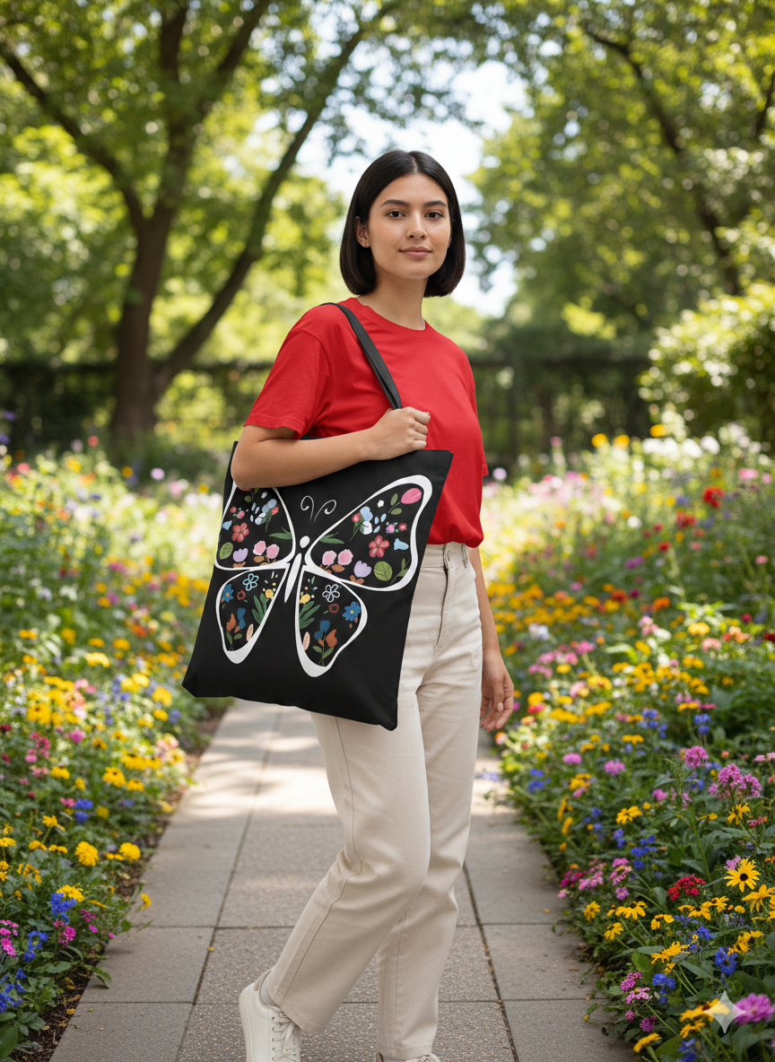 Step out in style with the Butterfly Bloom Tote Bag — a symbol of beauty, freedom, and creativity. Designed with a stunning floral butterfly motif on a sleek black background, this tote perfectly complements your modern, chic look. Whether for college, casual outings, or daily errands, it brings together functionality and fashion in one elegant piece.