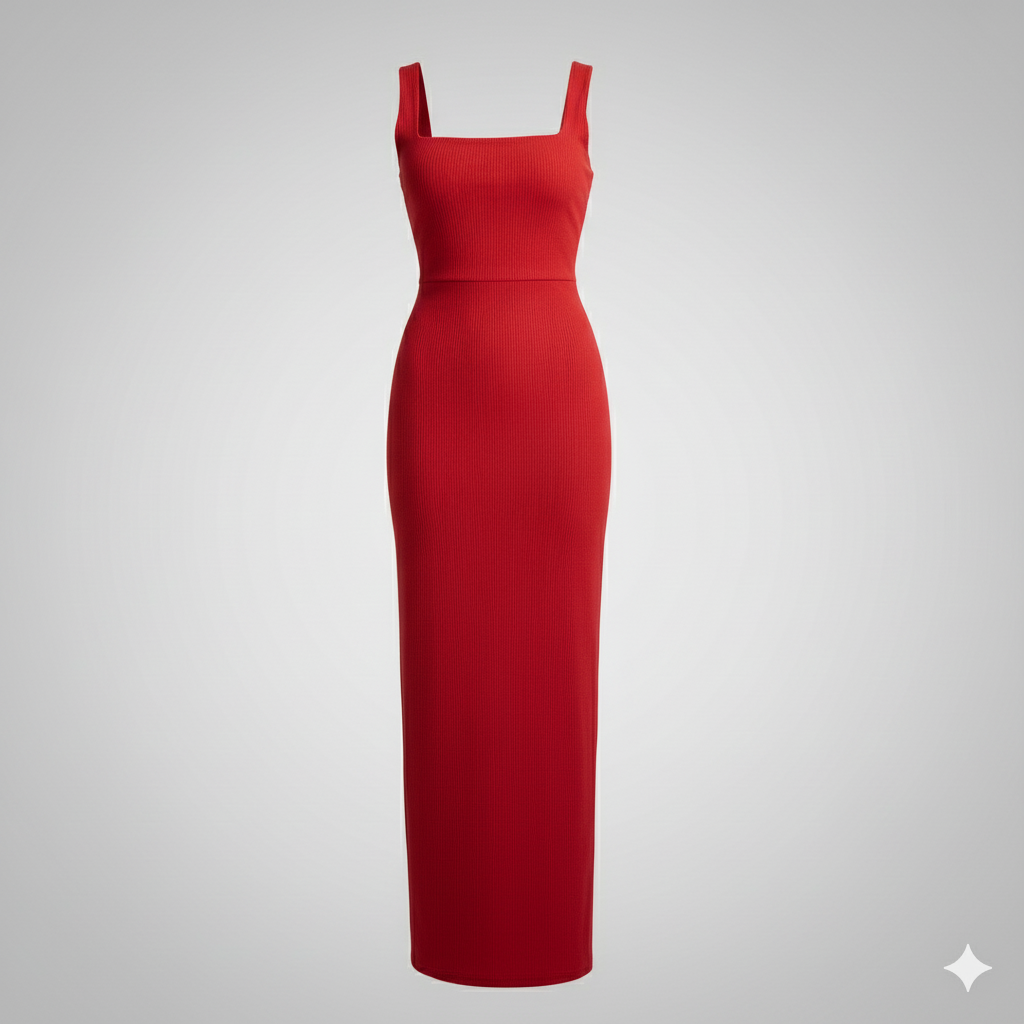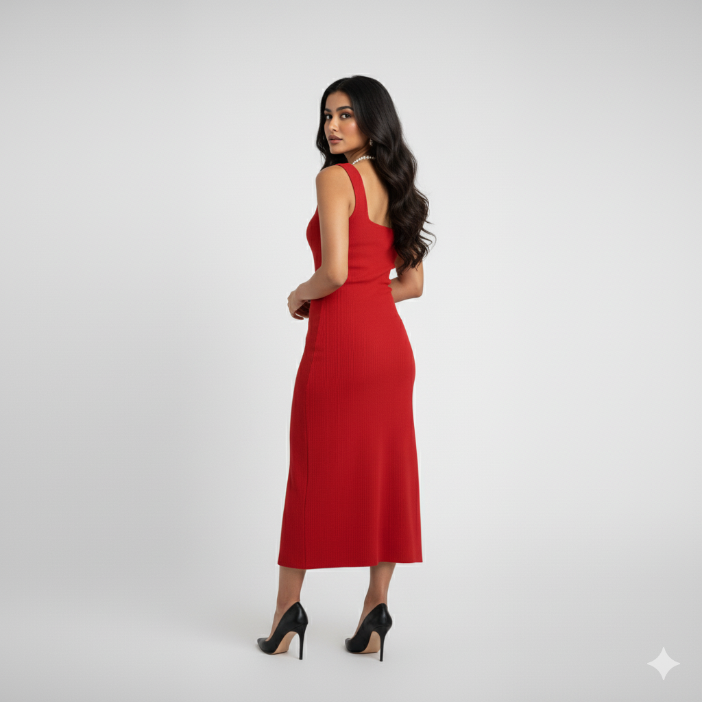 Show off your confidence and charm in this elegant red sleeveless bodycon midi dress, featuring a stylish square neck and flattering slim fit — perfect for parties, dates, or evening outings.