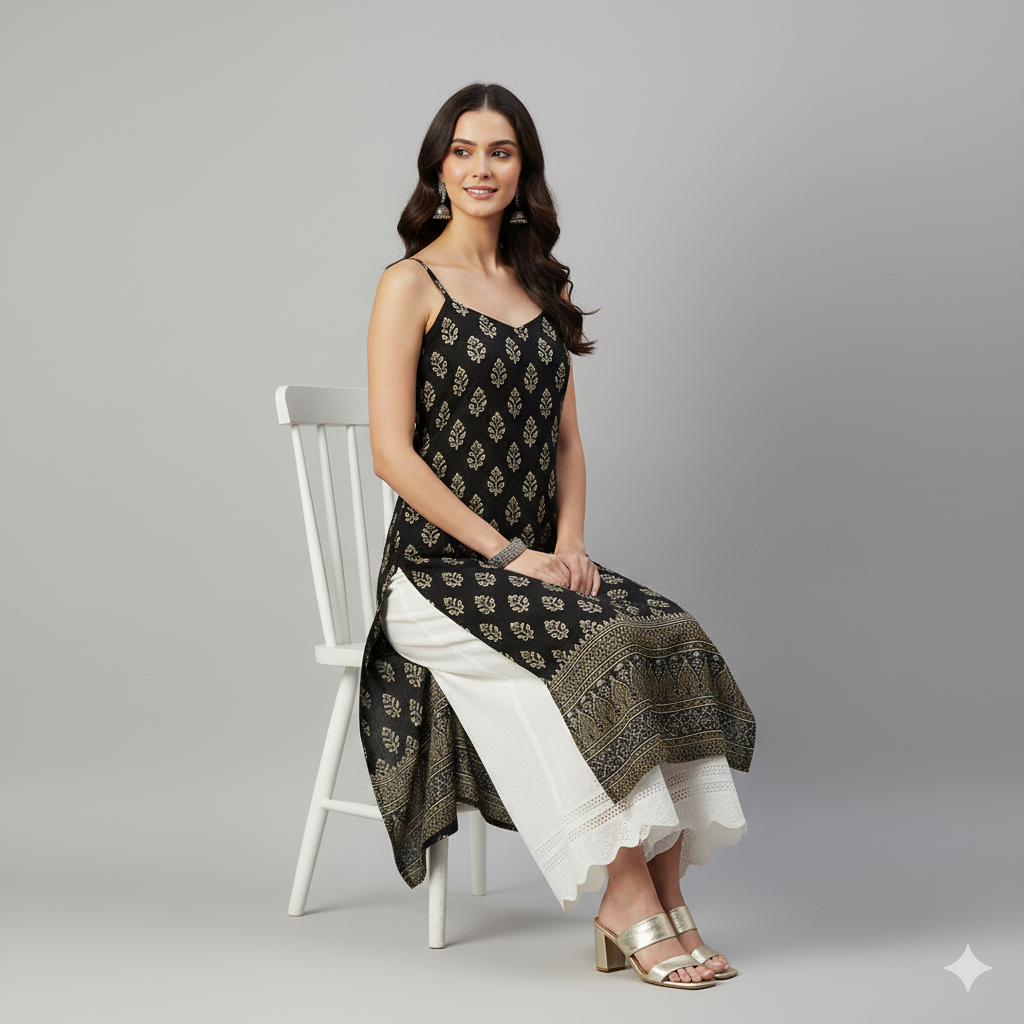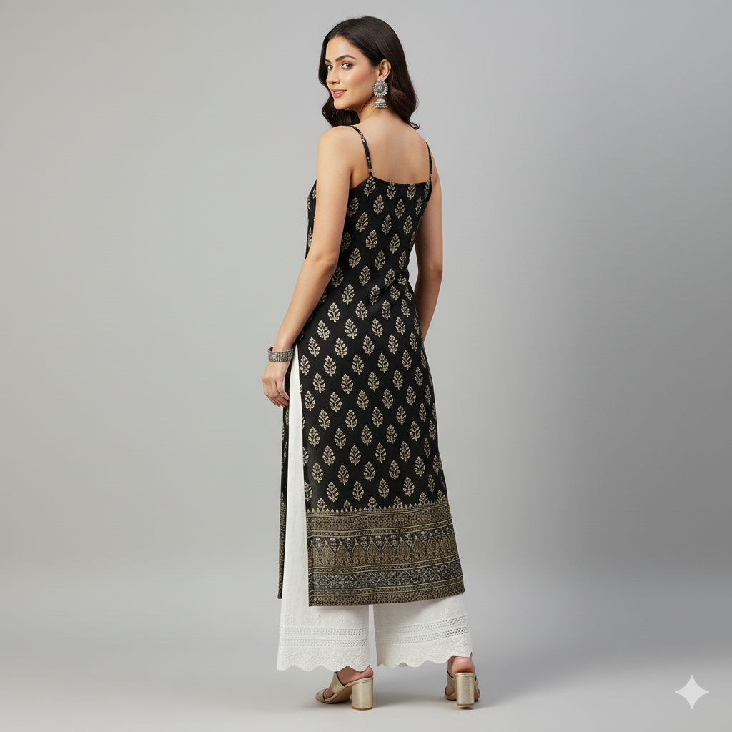 Turn heads with this Elegant Black & Golden Printed Sleeveless Kurti, a perfect fusion of modern minimalism and traditional charm. Crafted from premium Rayon fabric, this kurti ensures all-day comfort while exuding sophistication.