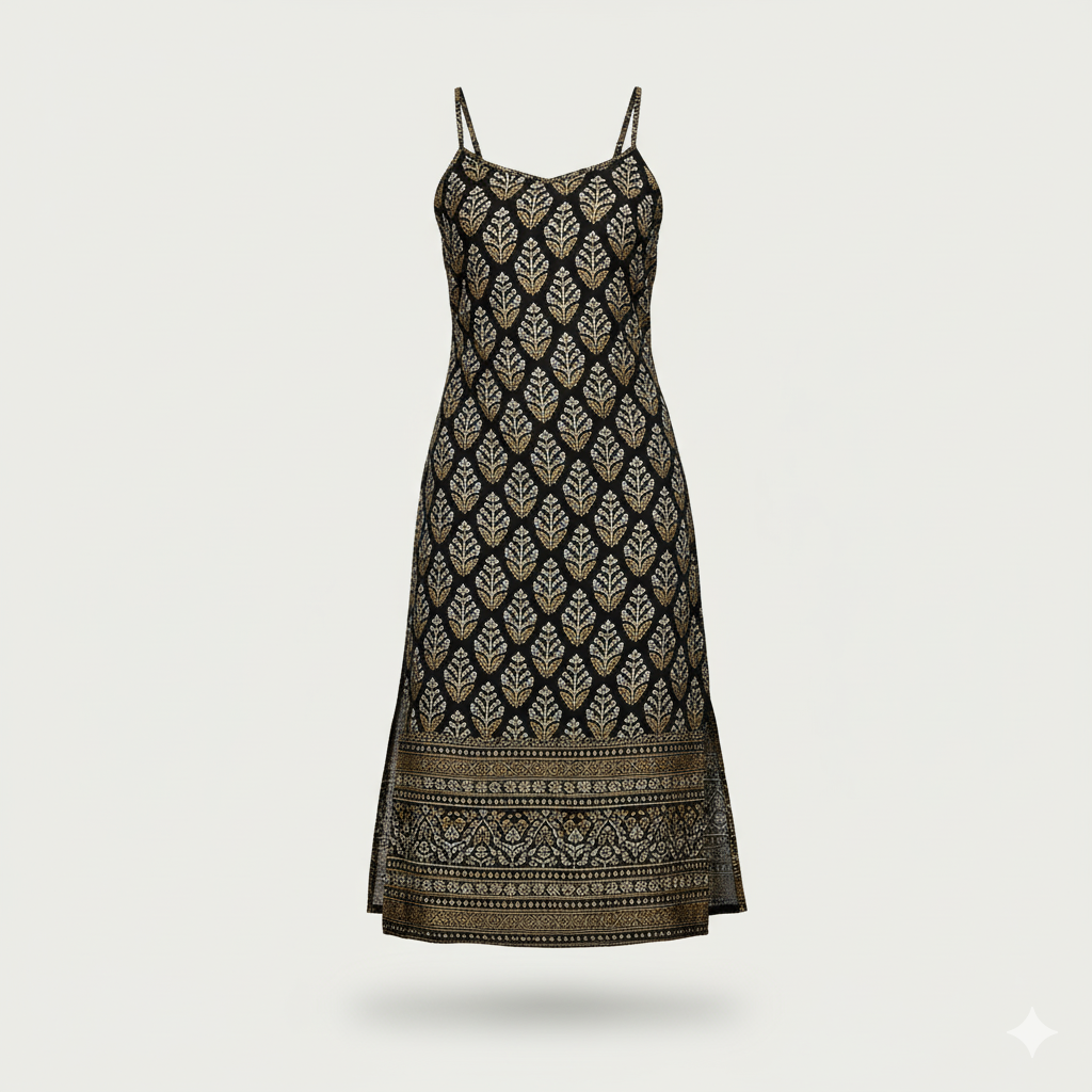 Featuring a golden ethnic block print pattern throughout, paired with a detailed border design at the hem, it brings a regal touch to your wardrobe. The spaghetti straps and straight-cut silhouette enhance your natural shape, offering a chic and breezy look ideal for both festive gatherings and casual outings.