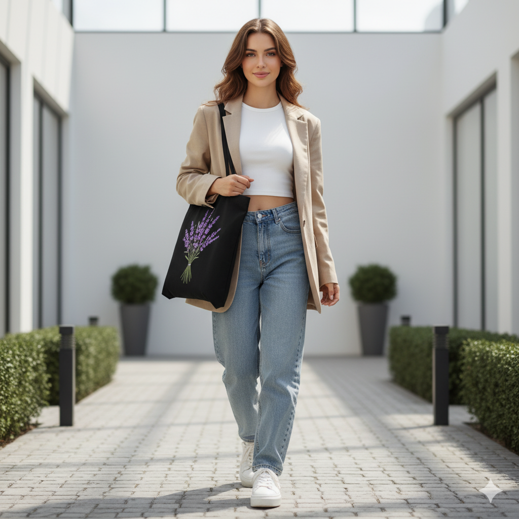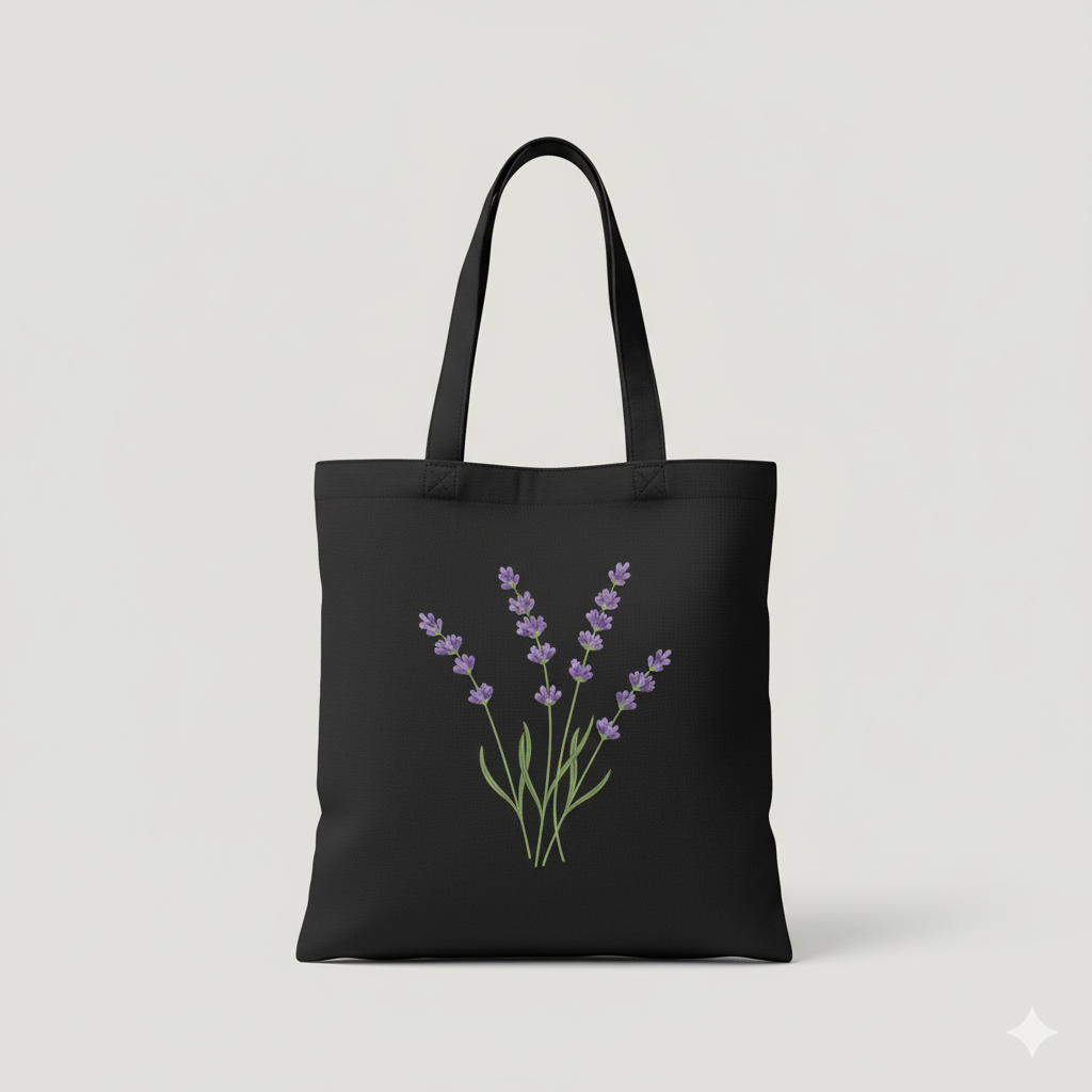 Carry your essentials in style with this elegant black tote bag featuring a minimal lavender floral design. The soft purple flowers add a fresh and graceful touch, making it perfect for anyone who loves subtle, nature-inspired fashion. Whether you’re heading to college, work, shopping, or a casual outing, this tote enhances your look with effortless charm.