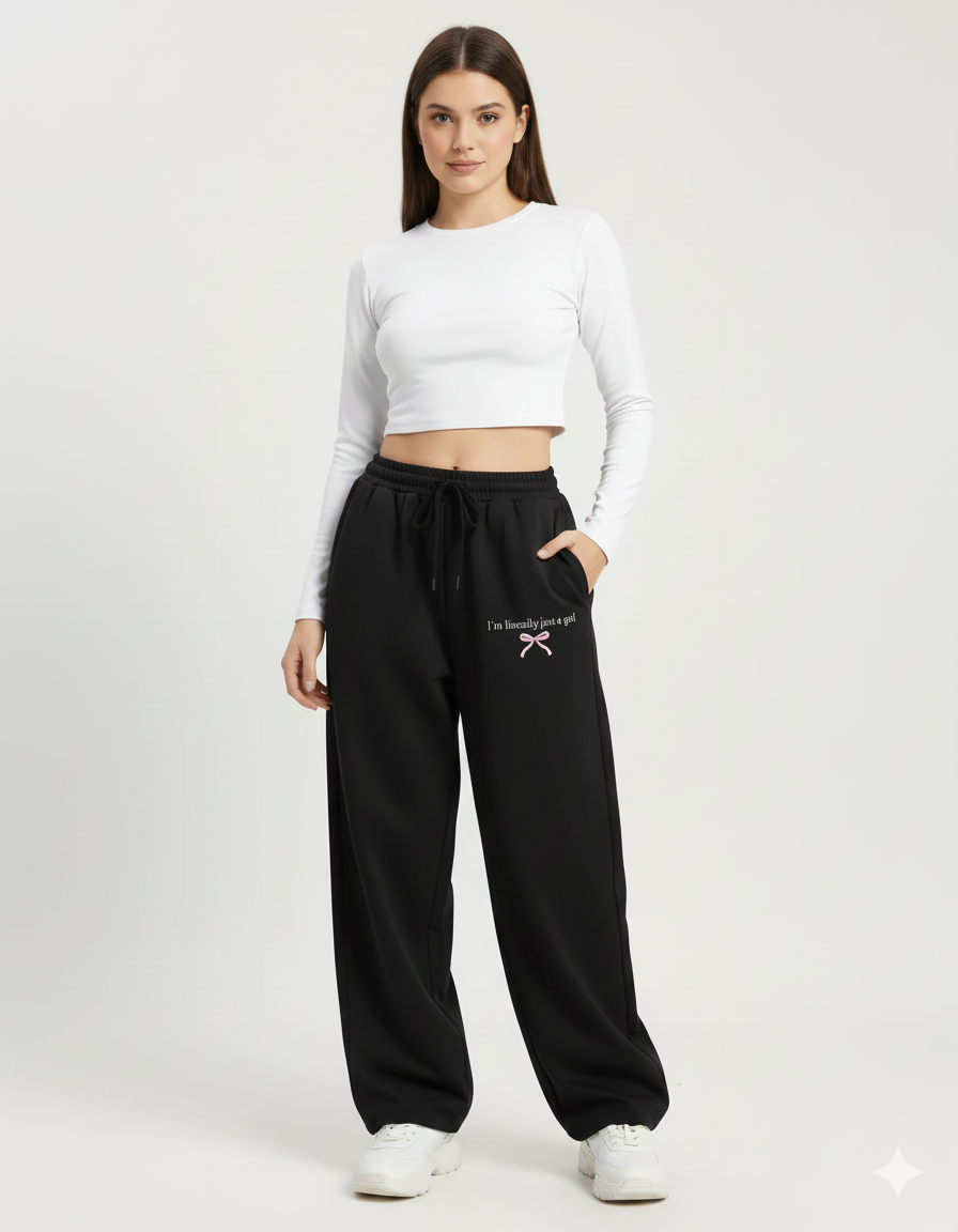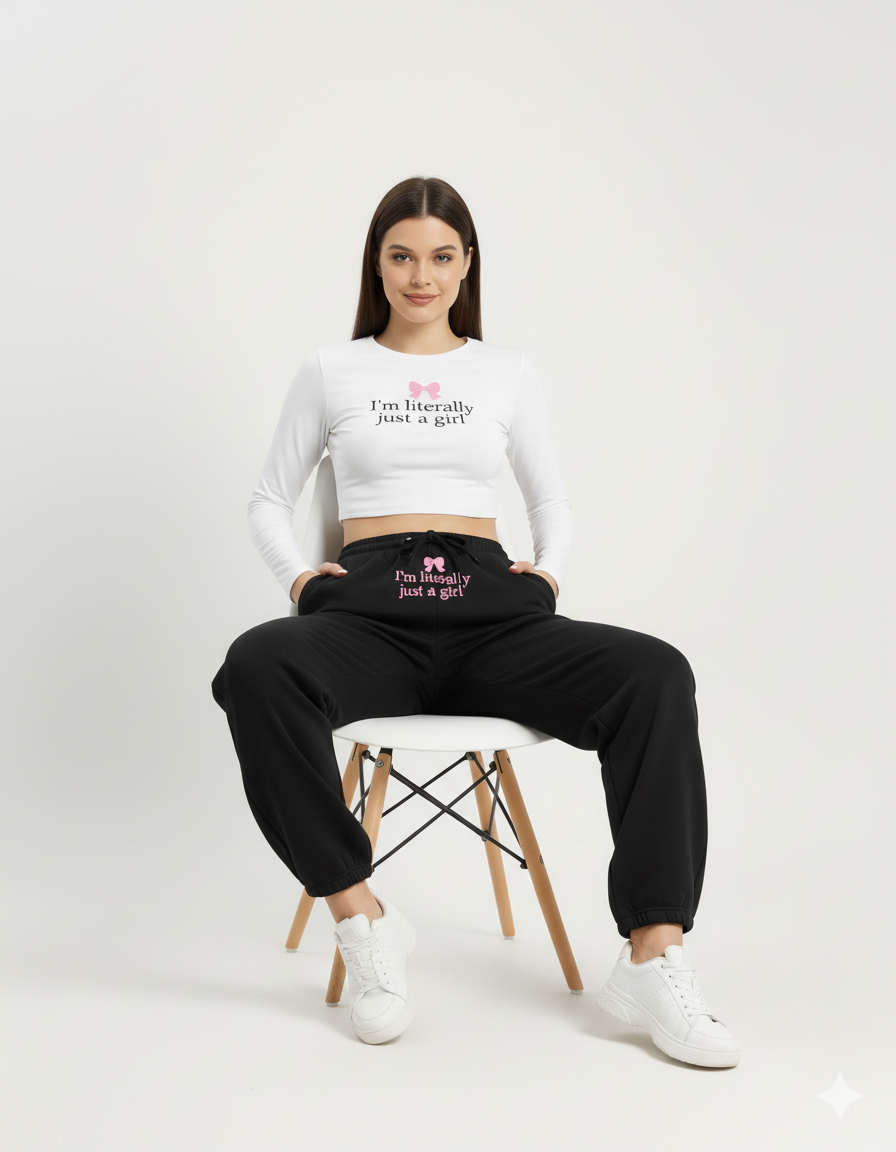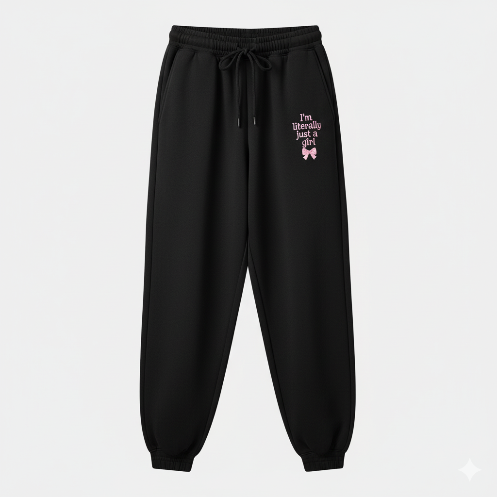 The minimalist design features a soft elastic waistband with an adjustable drawstring for a customized fit, and deep side pockets for convenience. The subtle “I’m literally just a girl” embroidery paired with a pink bow graphic adds a chic, feminine touch — making these joggers perfect for casual outings, gym sessions, or cozy lounge days.