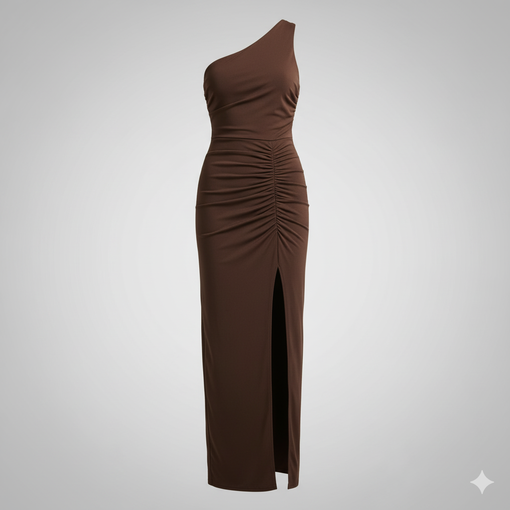 Turn heads wherever you go with this stunning one-shoulder bodycon maxi dress. Crafted from high-quality stretchable fabric, this dress hugs your curves beautifully, offering both comfort and elegance. The ruched detailing along the waist adds a flattering touch, while the side slit enhances your overall look with a hint of sophistication.
