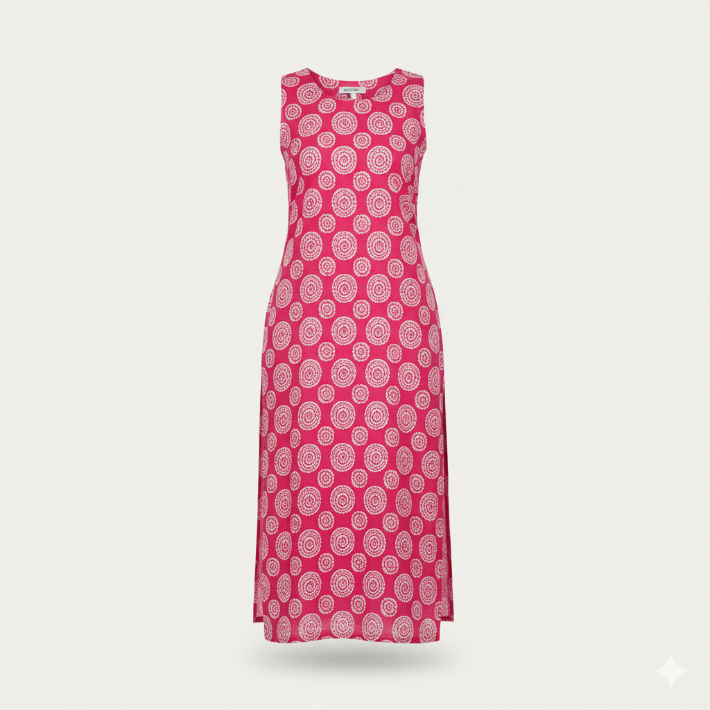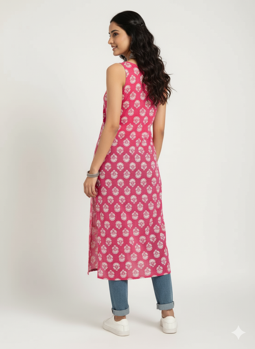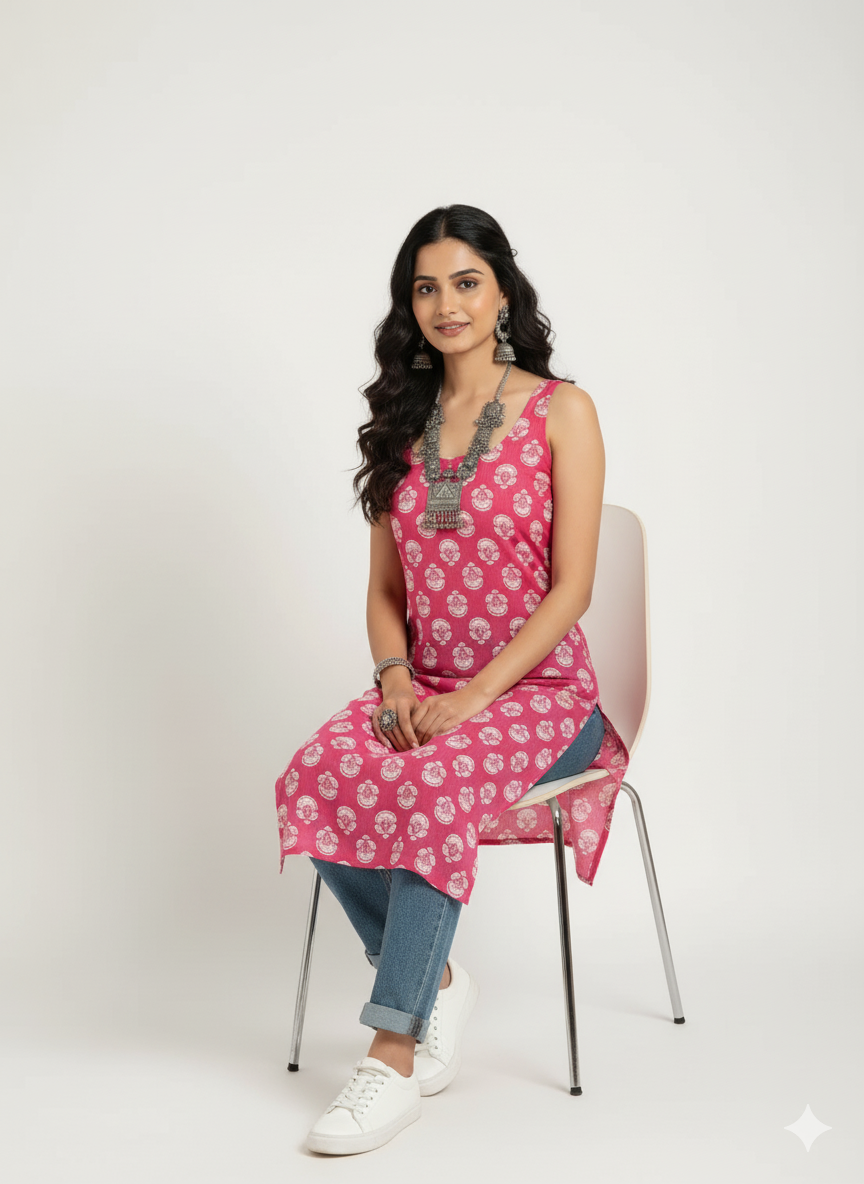 Step into effortless elegance with this pink sleeveless printed kurti, designed for women who appreciate comfort with a touch of sophistication. The soft Rayon fabric ensures all-day ease, while the floral print adds a charming traditional appeal. The stylish side slit gives it a modern twist, making it perfect for pairing with jeans, palazzos, or straight pants for a chic Indo-fusion look.